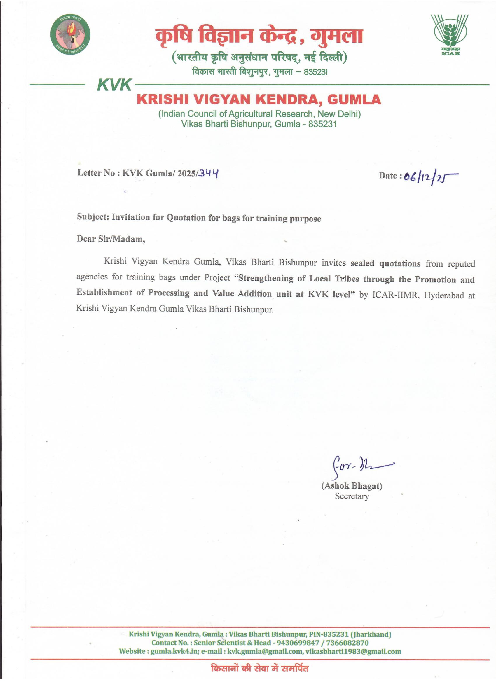 1 Invitation of Quotation for bags for training purpose Invitation of Quotation for bags for training purpose 2025-12-06 2025   View / Download